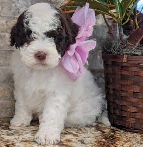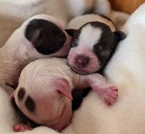 At 24 hours old, it is beginning to be apparent which puppies have a roan coat. The paw pads and around the nose begin to turn brown.